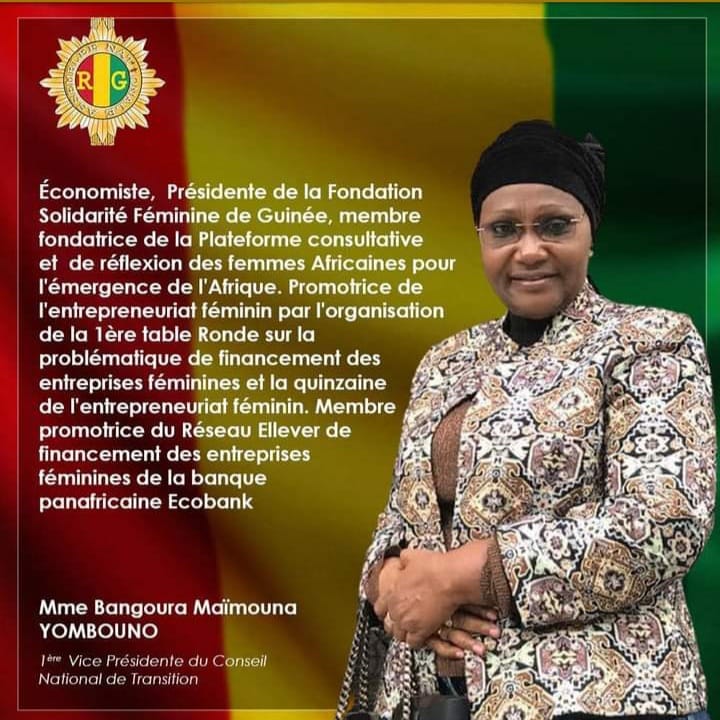 Économiste et Présidente de la Fondation Solidarité Féminine de Guinée, Mme Bangoura Maïmouna Yombouno est également membre fondatrice de la Plateforme consultative et de réflexion des femmes africaines pour l’émergence de l’Afrique. Elle est une fervente promotrice de l’entrepreneuriat féminin, ayant organisé la première Table Ronde sur le financement des entreprises féminines ainsi que la Quinzaine de l’entrepreneuriat féminin. Membre promotrice du Réseau Ellever pour le financement des entreprises féminines, soutenu par la banque panafricaine Ecobank, Mme Yombouno s’engage activement pour l’autonomisation des femmes et le développement durable en Afrique. Elle est également 1ère Vice-Présidente du Conseil National de Transition.